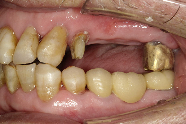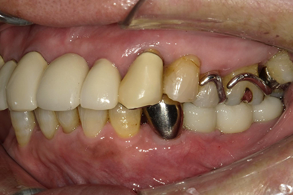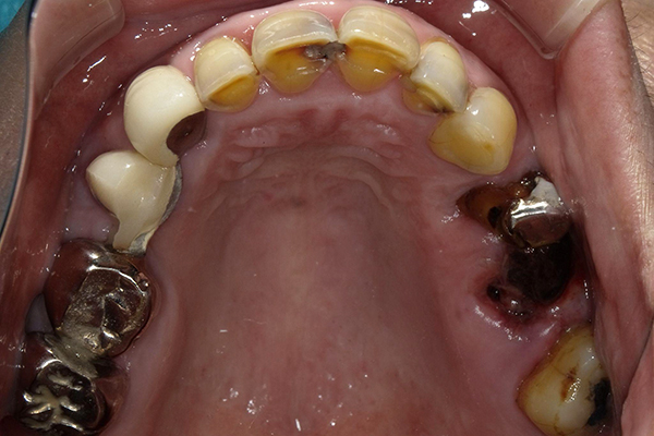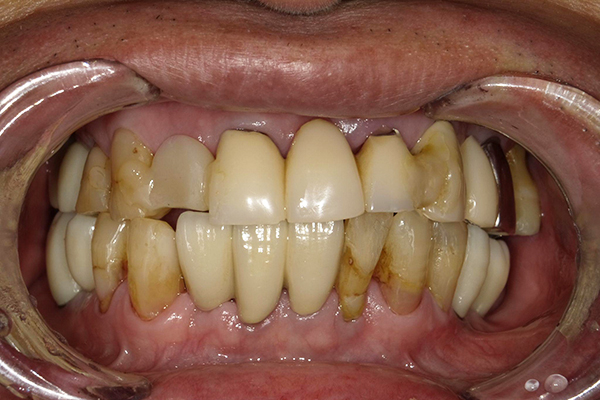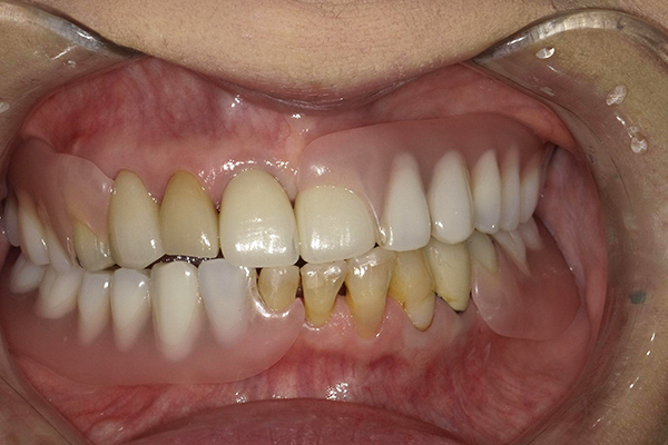 | 治療内容 | 右側上顎大臼歯2歯、下顎大臼歯2歯のインプラント治療。虫歯から歯根破折を起こした右側臼歯に 代わって、顎の骨にインプラントを埋め込み、その 上に人工の歯を被せるインプラント治療を行い、 機能面の回復を行いました。 |