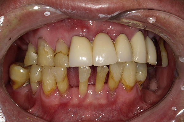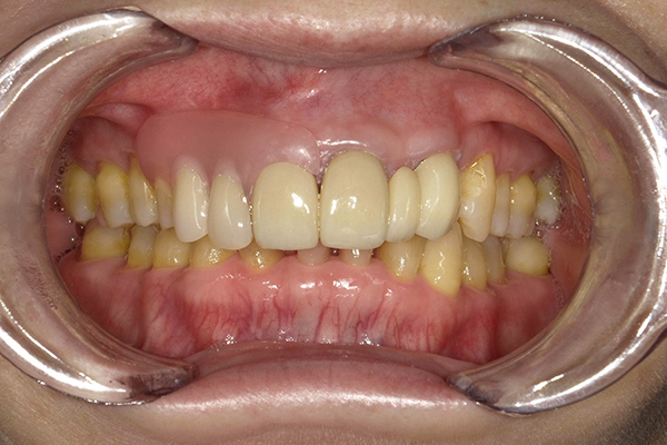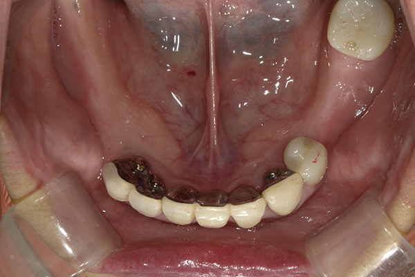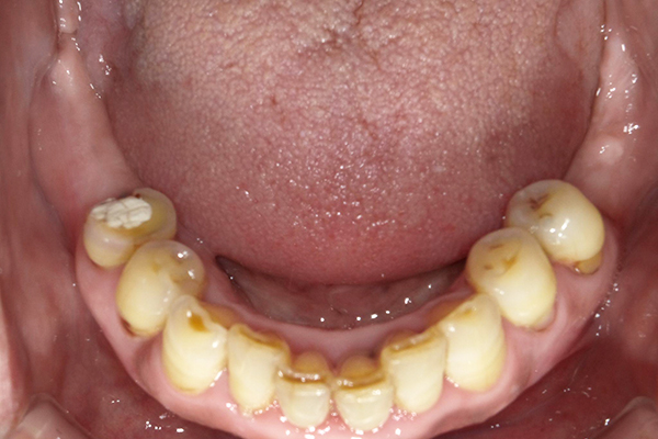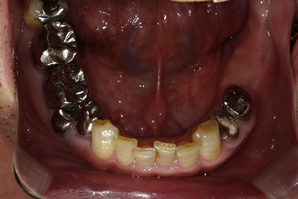 | 治療内容 | 下顎前歯部インプラント治療(1歯)、隣在歯ジルコニアクラウン(2歯) |