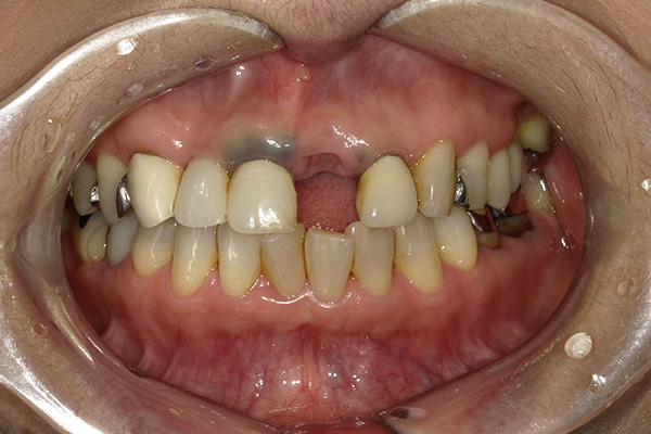 | 治療内容 | 左上顎前歯部インプラント治療。歯根破折を起こした左側前歯に 代わって、顎の骨にインプラントを埋め込み、その 上に人工の歯を被せるインプラント治療を行い、 機能面の回復を行いました。 |